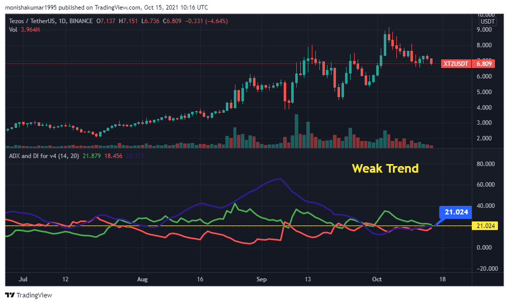 The above chart represents the ADX of Tezos. Currently, Tezos lies in the range at 21.024, so it indicates a weak trend.
