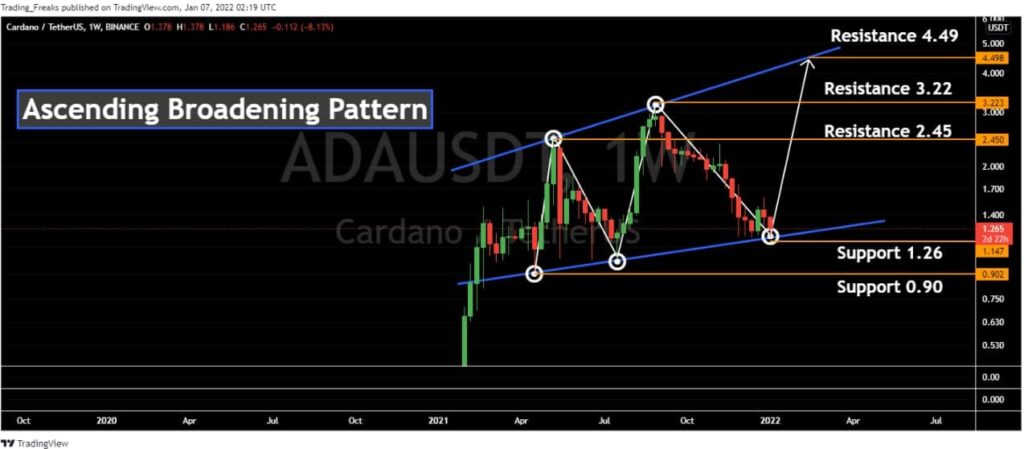 Currently, ADA is at $1.23. If the pattern continues, the price of ADA might reach the resistance level to $2.45 and even high to $4.49. If the trend reverses, then the price of ADA may fall to $1.26.